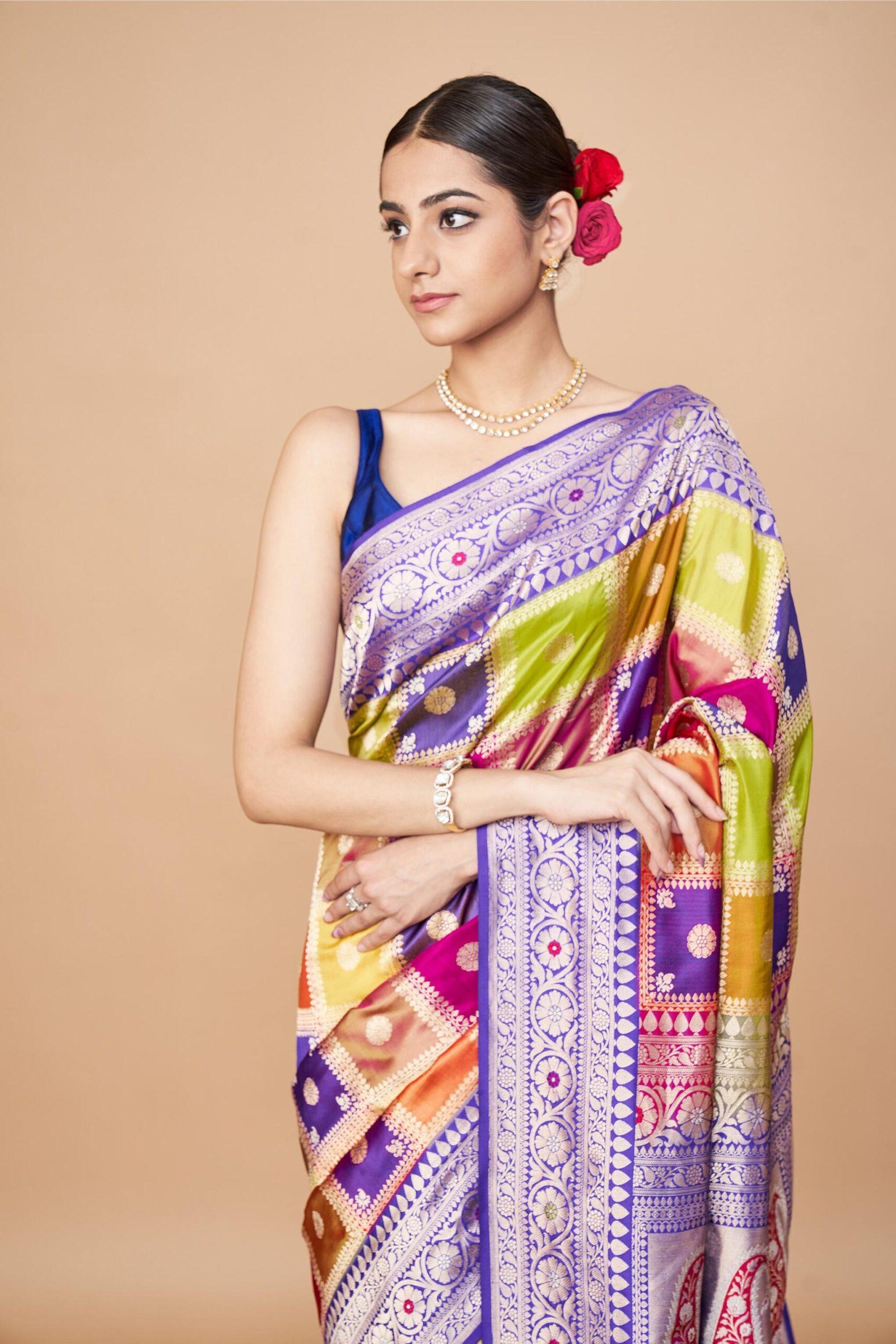 Purple Banarasi Rangkaat saree with multi-colour Square detail in Katan Silk
